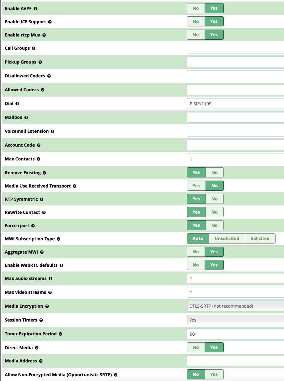 I did make a separate extension for it. This is the advanced config. I don’t remember specifically selecting all these… some of them might be toggled on due to WebRTC Defaults (e.g. ICE, AVPF, RTCP mux)